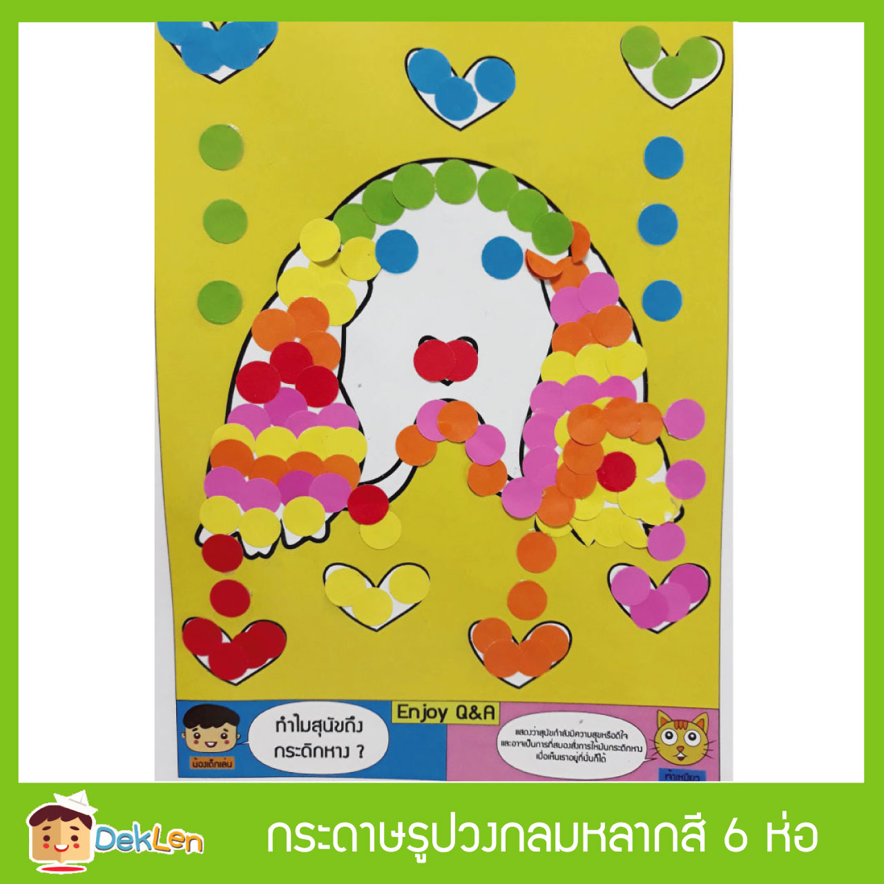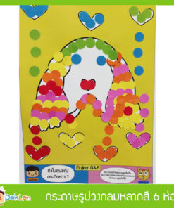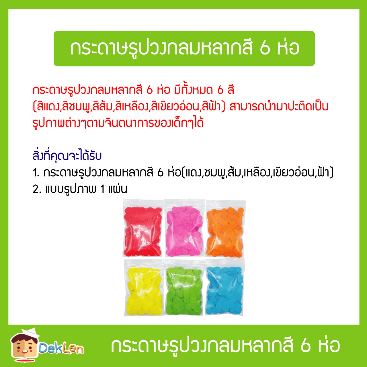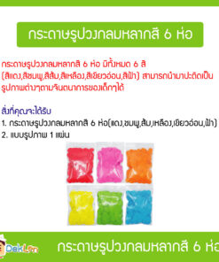 - กระดาษรูปวงกลมหลากสี 6 ห่อ มีทั้งหมด 6 สี (สีแดง,สีชมพู,สีส้ม,สีเหลือง,สีเขียวอ่อน,สีฟ้า) สามารถนำมาปะติดเป็นรูปภาพต่างๆตามจินตนาการของเด็กๆได้