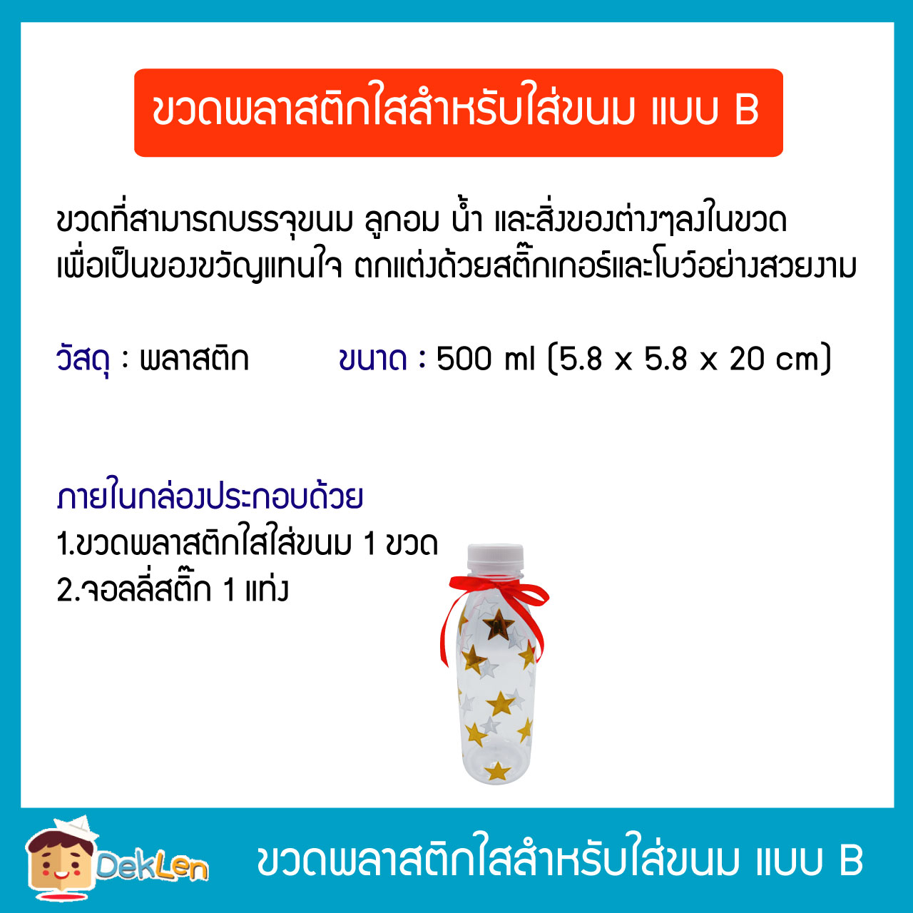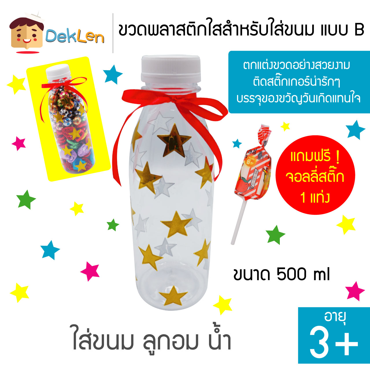 แบบ B ขวดพลาสติกใสสำหรับใส่ขนม ลูกอม น้ำ ขนาด 500ml ตกแต่งขวดอย่างสวยงาม ติดสติ๊กเกอร์น่ารักๆ บรรจุของขวัญวันเกิดแทนใจ
