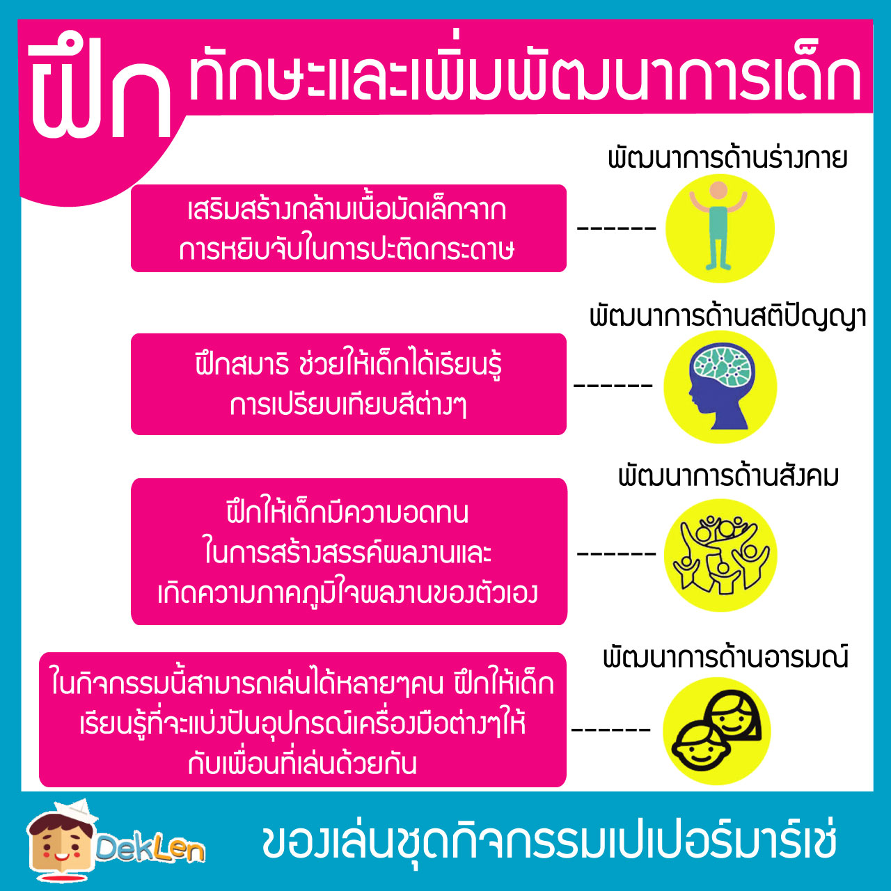 - พัฒนาการด้านสติปัญญา ฝึกสมาธิ ช่วยให้เด็กได้เรียนรู้การเปรียบเทียบสีต่างๆ