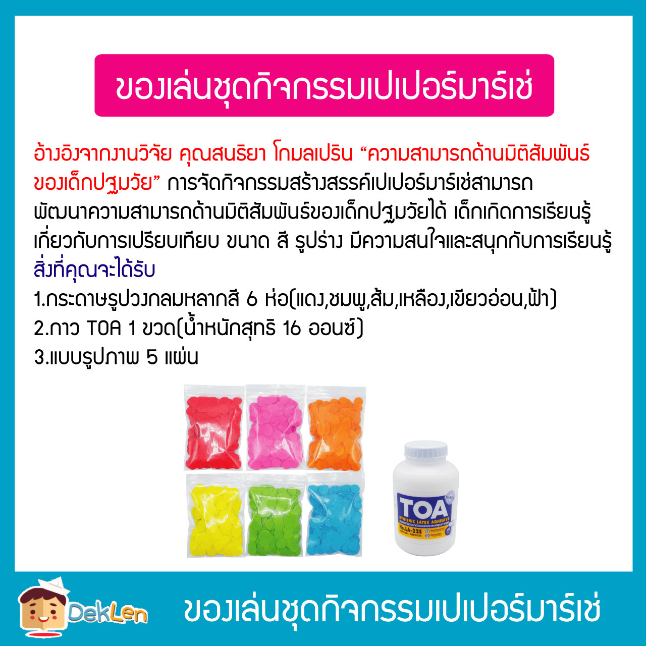 - ขนาด : กระดาษรูปวงกลม 6 ห่อ (1 ห่อ ขนาด 8×12 cm),กาว TOA ขนาด16 ออนซ์