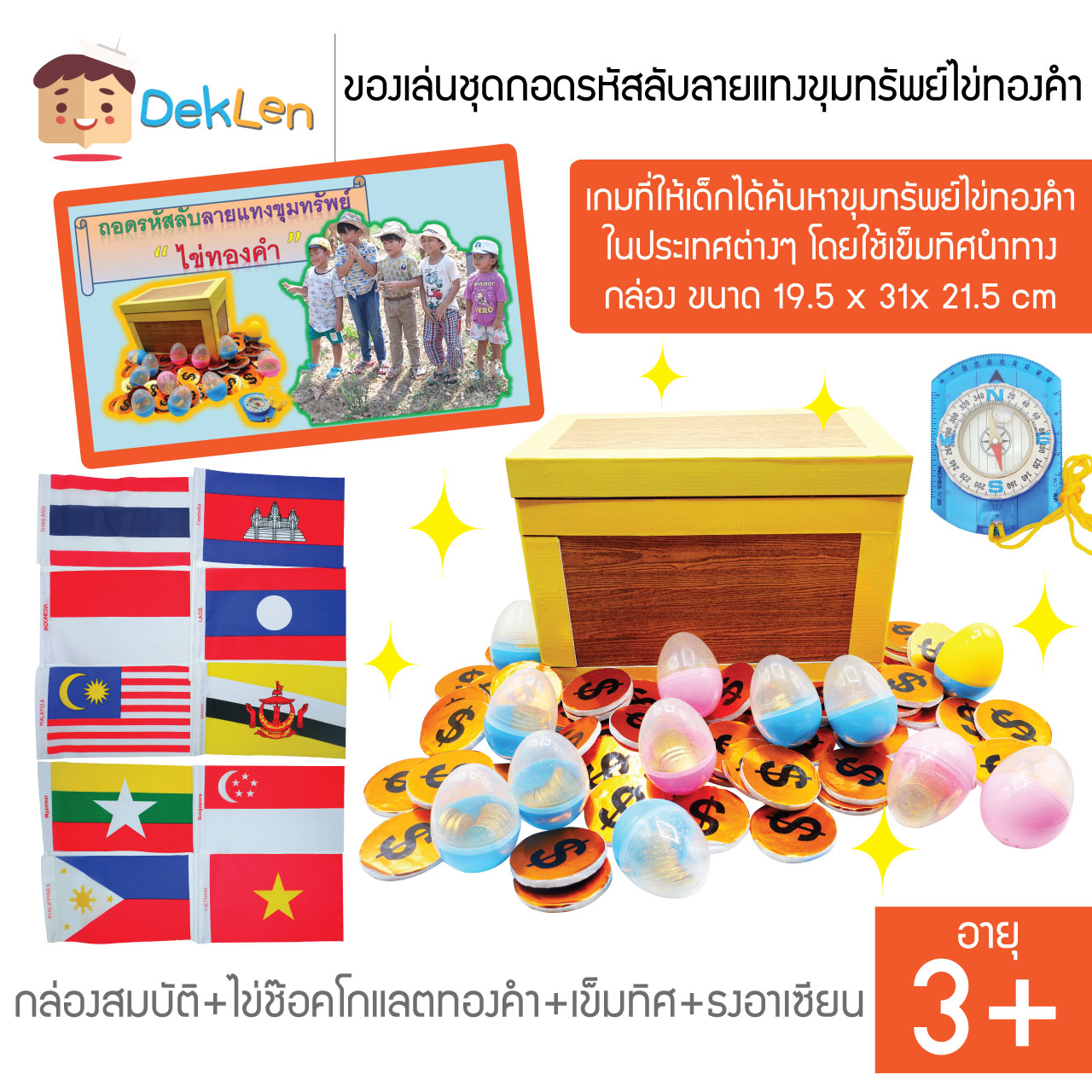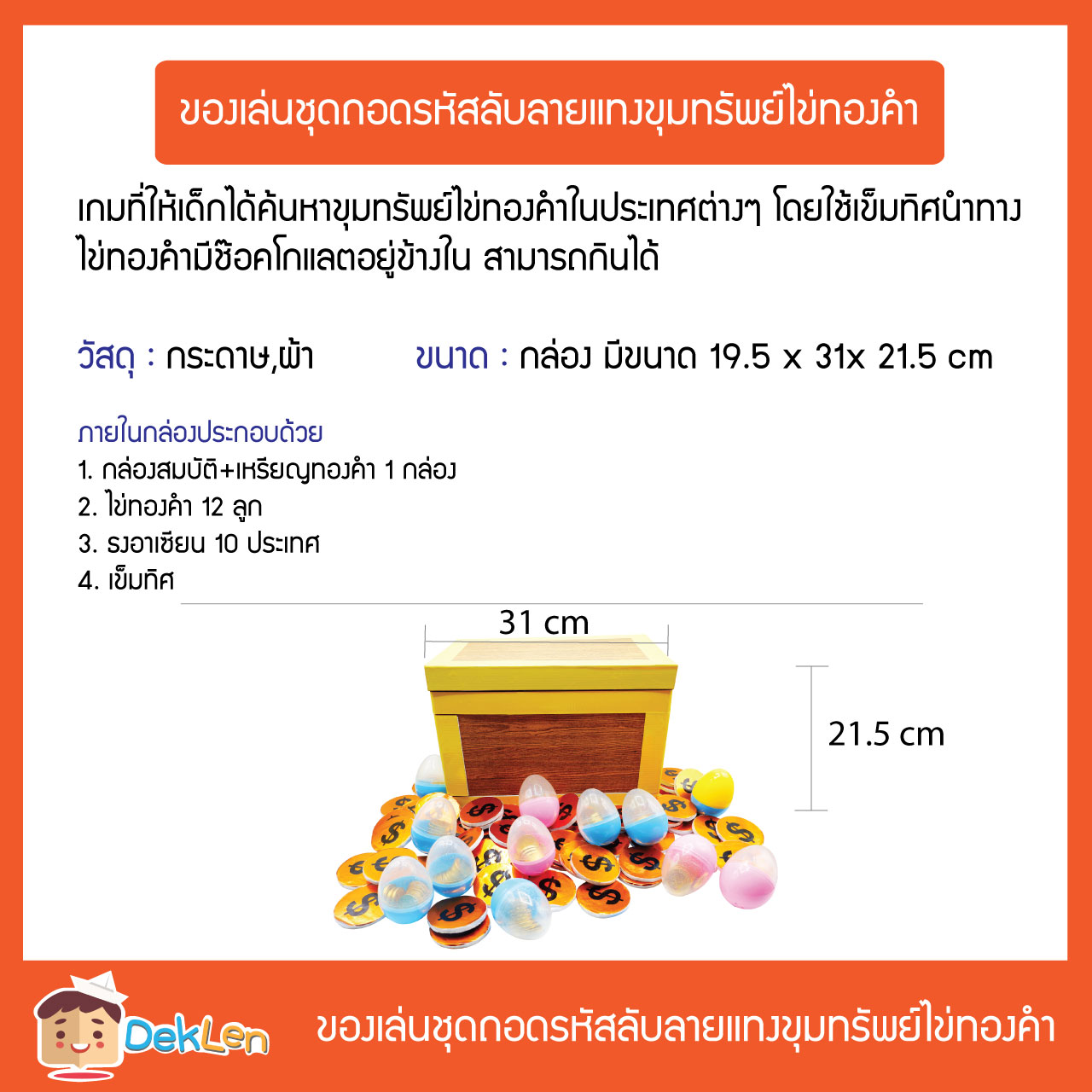 ของเล่นชุดถอดรหัสลับลายแทงขุมทรัพย์ไข่ทองคำ เป็นเกมที่ให้เด็กได้ค้นหาขุมทรัพย์ไข่ทองคำในประเทศต่างๆ โดยใช้เข็มทิศนำทาง