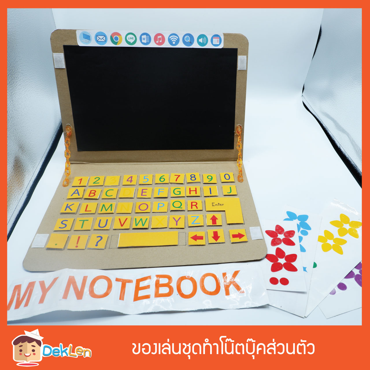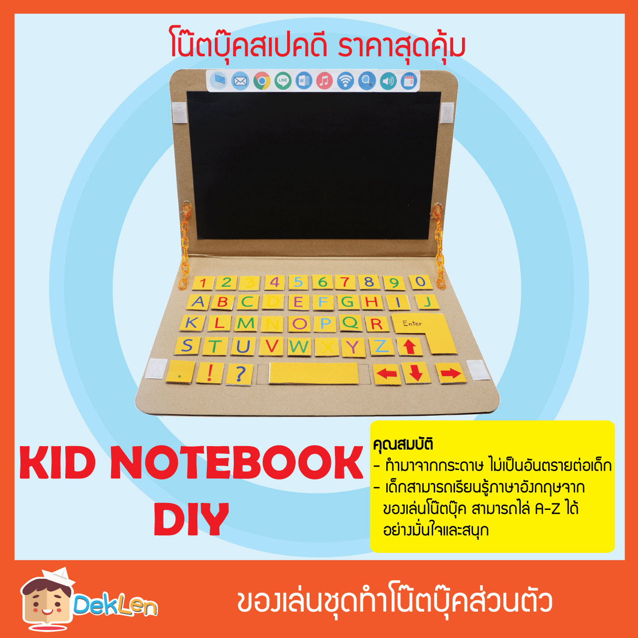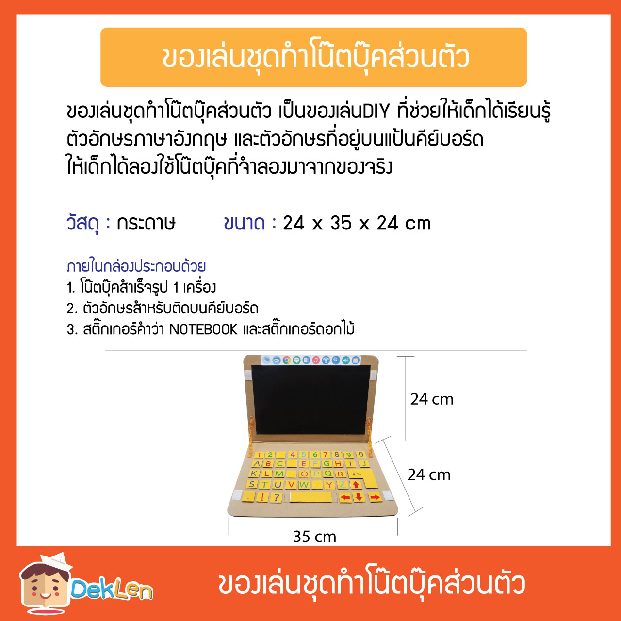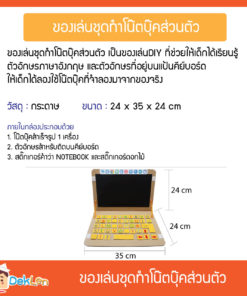 ของเล่นชุดทำโน๊ตบุ๊คส่วนตัว เป็นของเล่นDIY ที่ช่วยให้เด็กได้เรียนรู้ตัวอักษรภาษาอังกฤษ และตัวอักษรที่อยู่บนแป้นคีย์บอร์ด ให้เด็กได้ลองใช้โน๊ตบุ๊คที่จำลองมาจากของจริง