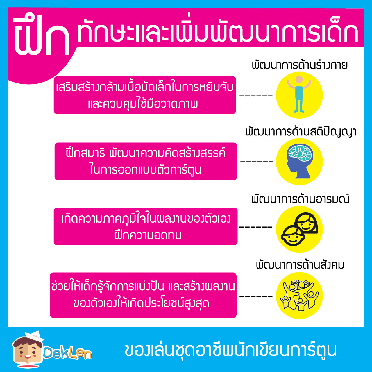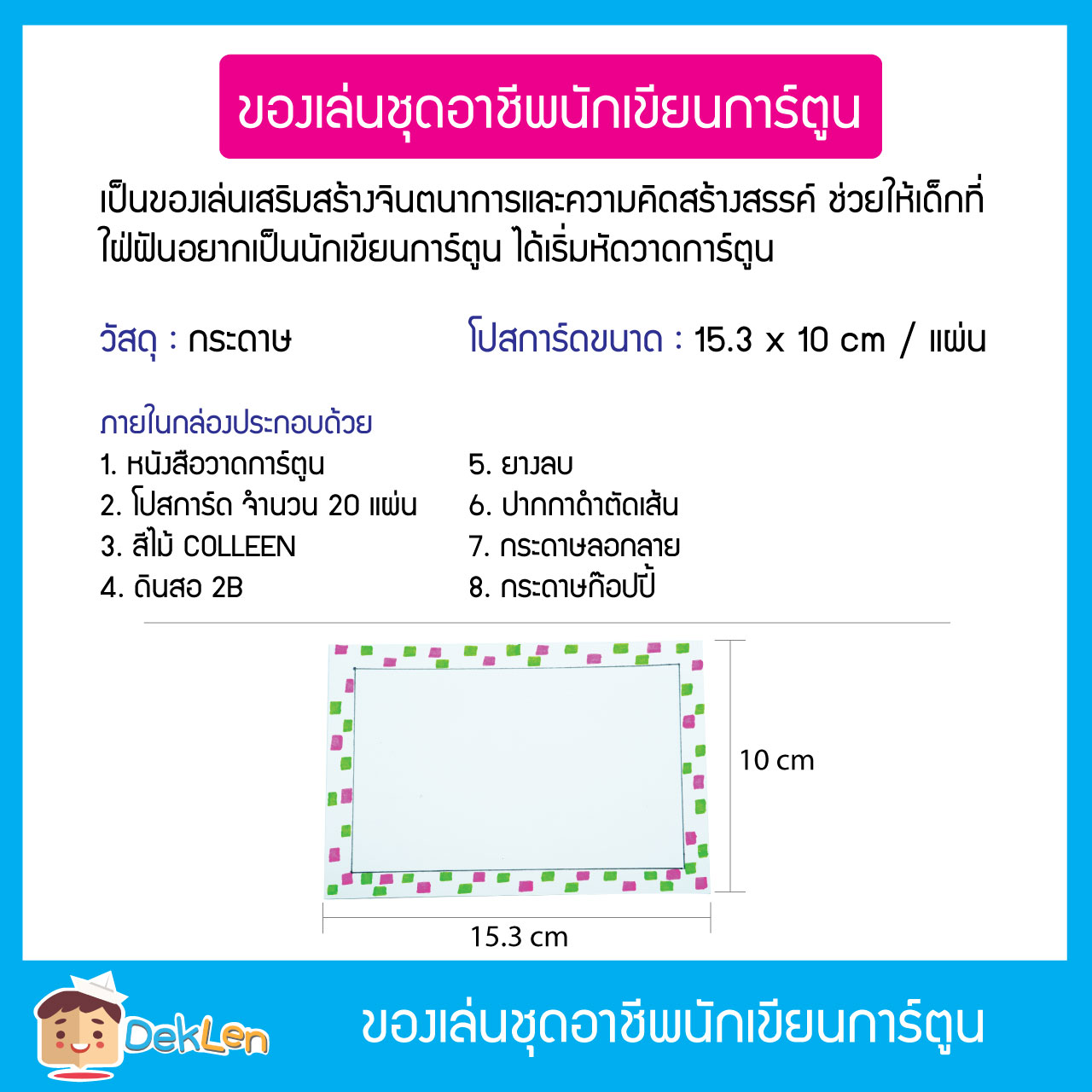 ของเล่นชุดอาชีพนักเขียนการ์ตูน เป็นของเล่นเสริมสร้างจินตนาการและความคิดสร้างสรรค์ ช่วยให้เด็กที่ใฝ่ฝันอยากเป็นนักเขียนการ์ตูน ได้เริ่มหัดวาดการ์ตูน จากอุปกรณ์สำหรับวาดการ์ตูน