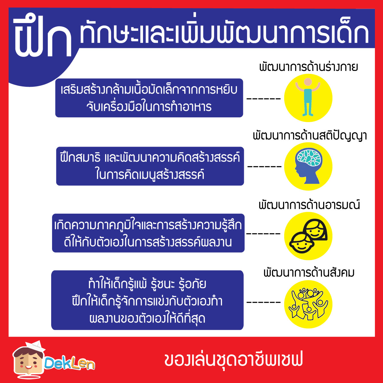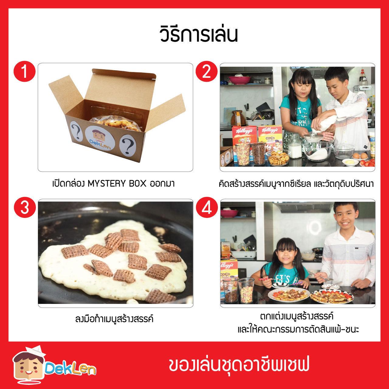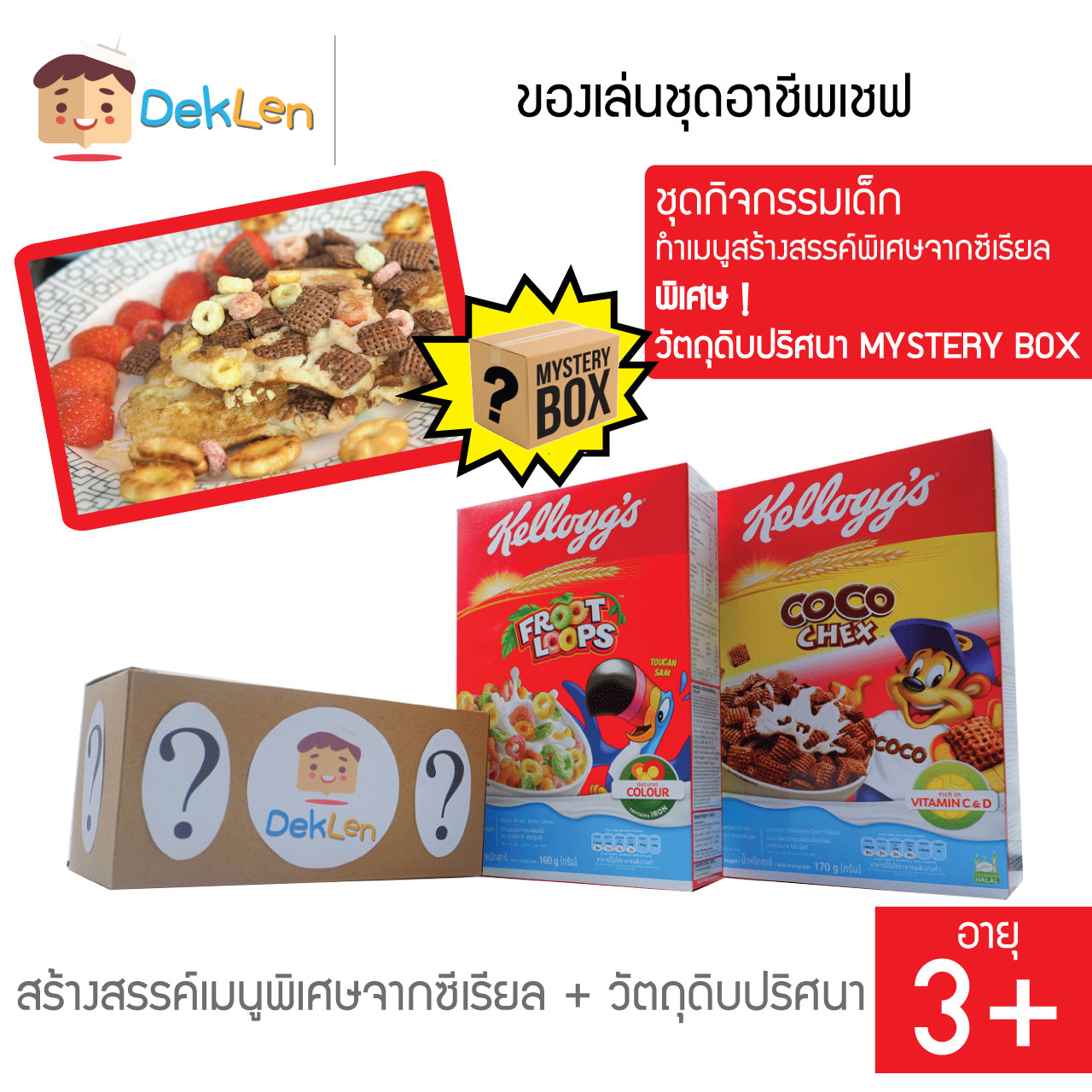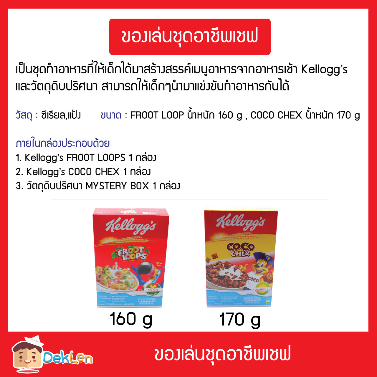 ของเล่นชุดอาชีพเชฟ เป็นชุดทำอาหารที่ให้เด็กได้มาสร้างสรรค์เมนูอาหารจากอาหารเช้า Kellogg’s และวัตถุดิบปริศนา สามารถให้เด็กๆนำมาแข่งขันทำอาหารกันได้ ก็จะได้เมนูพิเศษที่ไม่เหมือนใคร เมนูที่เป็นเอกลักษณ์เฉพาะตัว