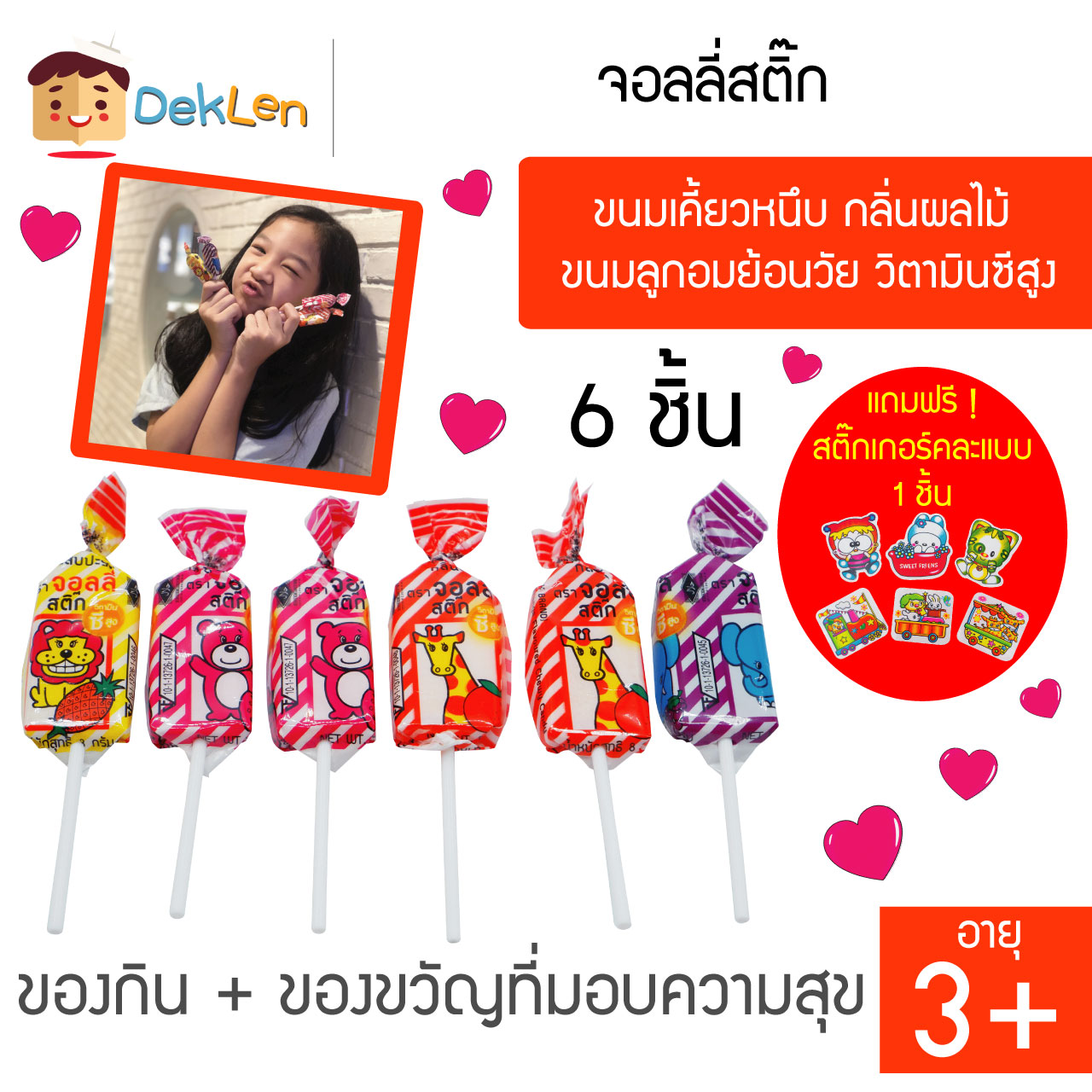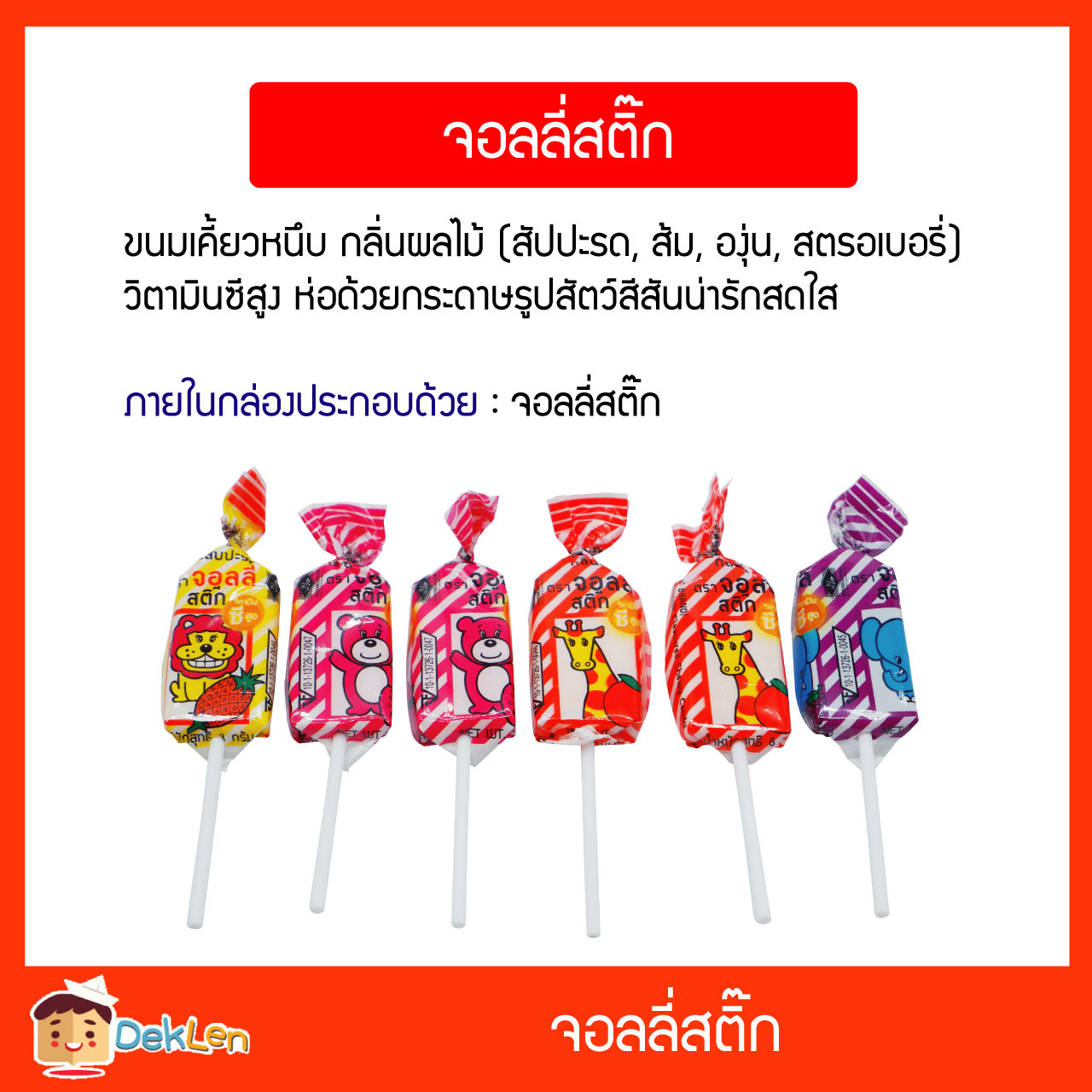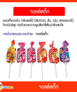 • จอลลี่สติ๊ก ขนมเคี้ยวหนึบ กลิ่นผลไม้ (สัปปะรด, ส้ม, องุ่น, สตรอเบอรี่) วิตามินซีสูง ห่อด้วยกระดาษรูปสัตว์สีสันน่ารักสดใส