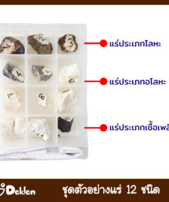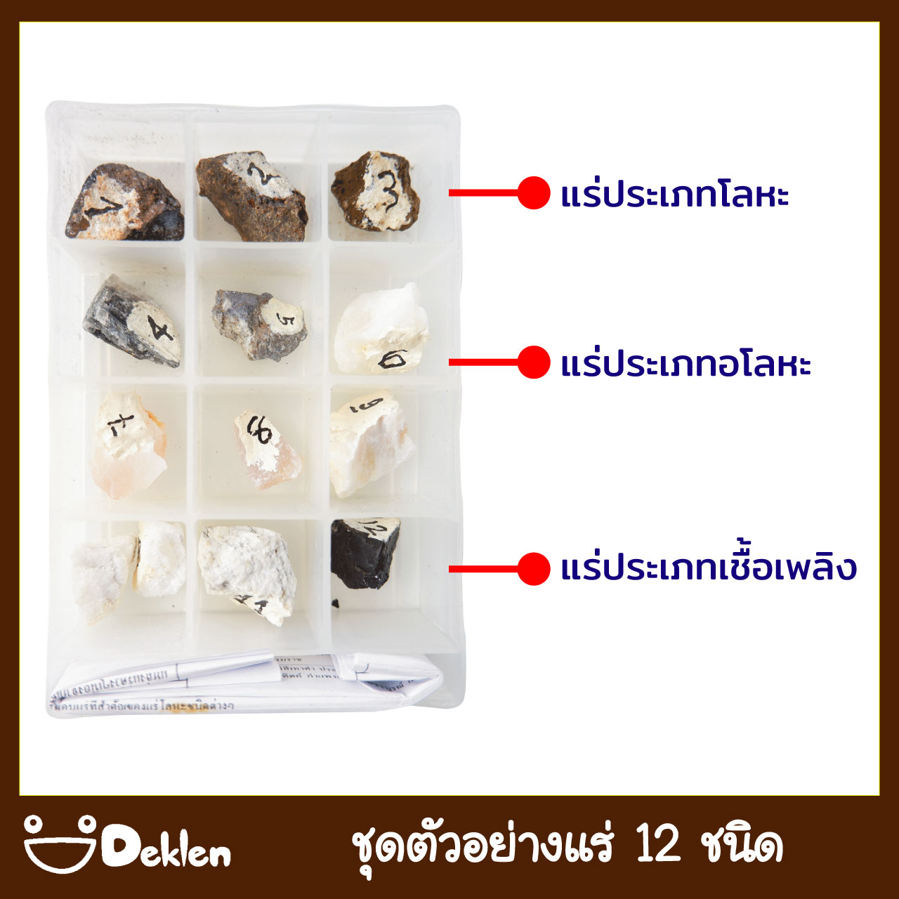 ภายในกล่องประกอบด้วย : ชุดตัวอย่างแร่ 12 ชนิด, สติ๊กเกอร์ 1 แผ่น