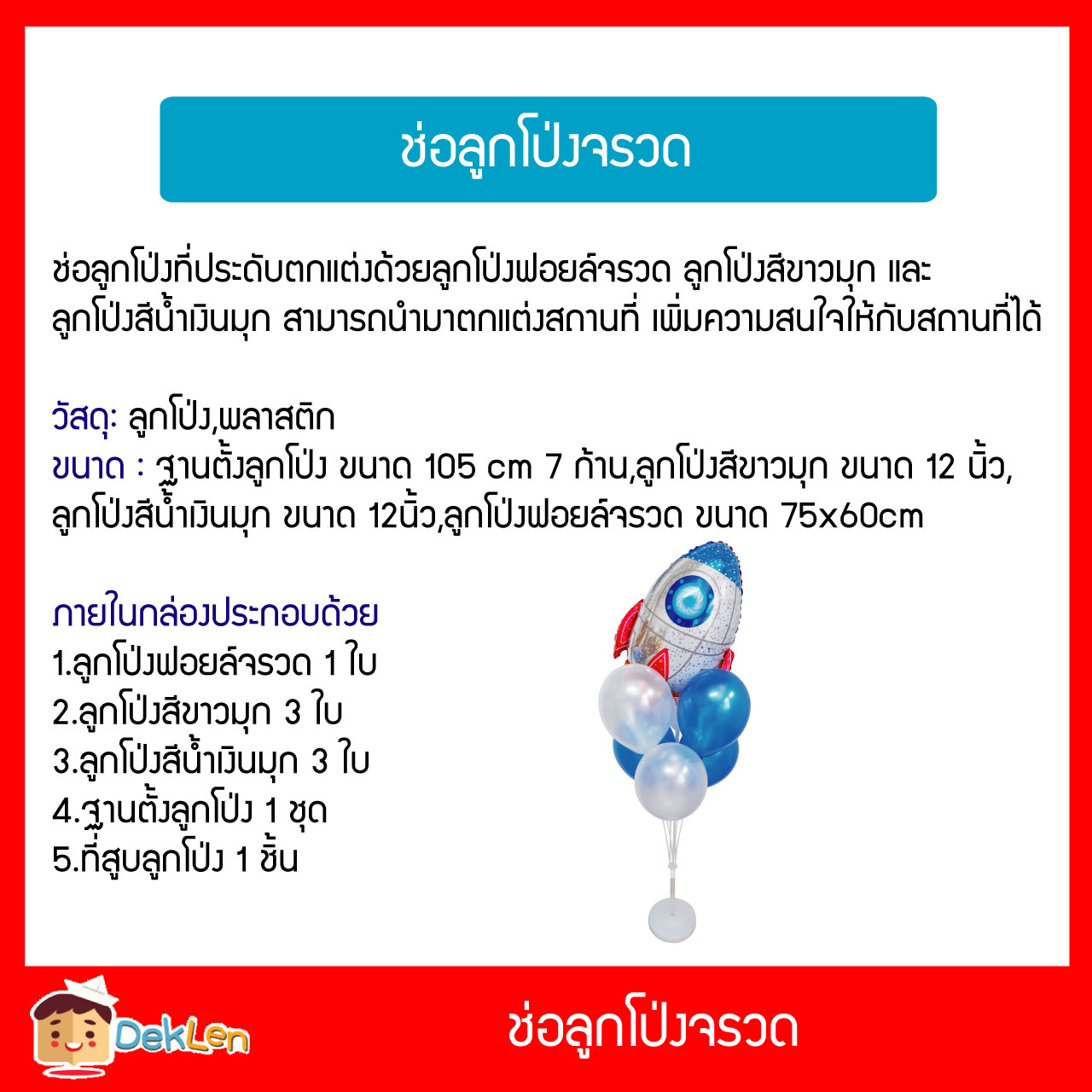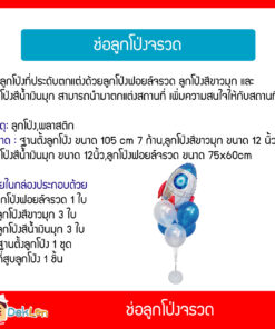 ขนาด : ฐานตั้งลูกโป่ง ขนาด 105 cm 7 ก้าน,ลูกโป่งสีขาวมุก ขนาด 12 นิ้ว,ลูกโป่งสีน้ำเงินมุก ขนาด 12นิ้ว,ลูกโป่งฟอยล์จรวด ขนาด 75x60cm