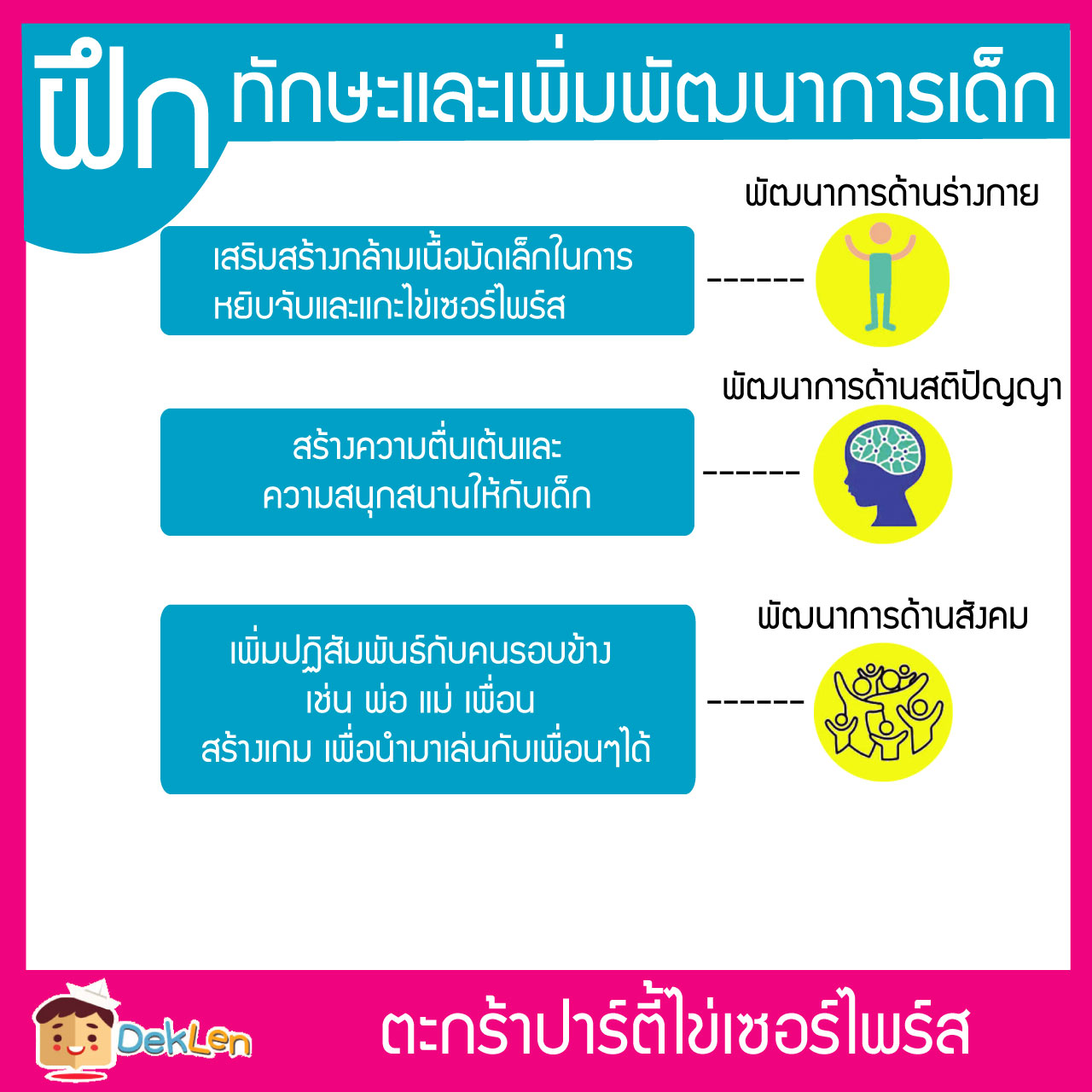 พัฒนาการด้านสังคม เพิ่มปฏิสัมพันธ์กับคนรอบข้าง เช่น พ่อ แม่ เพื่อน สร้าง เกม เพื่อนำมาเล่นกับเพื่อนๆได้