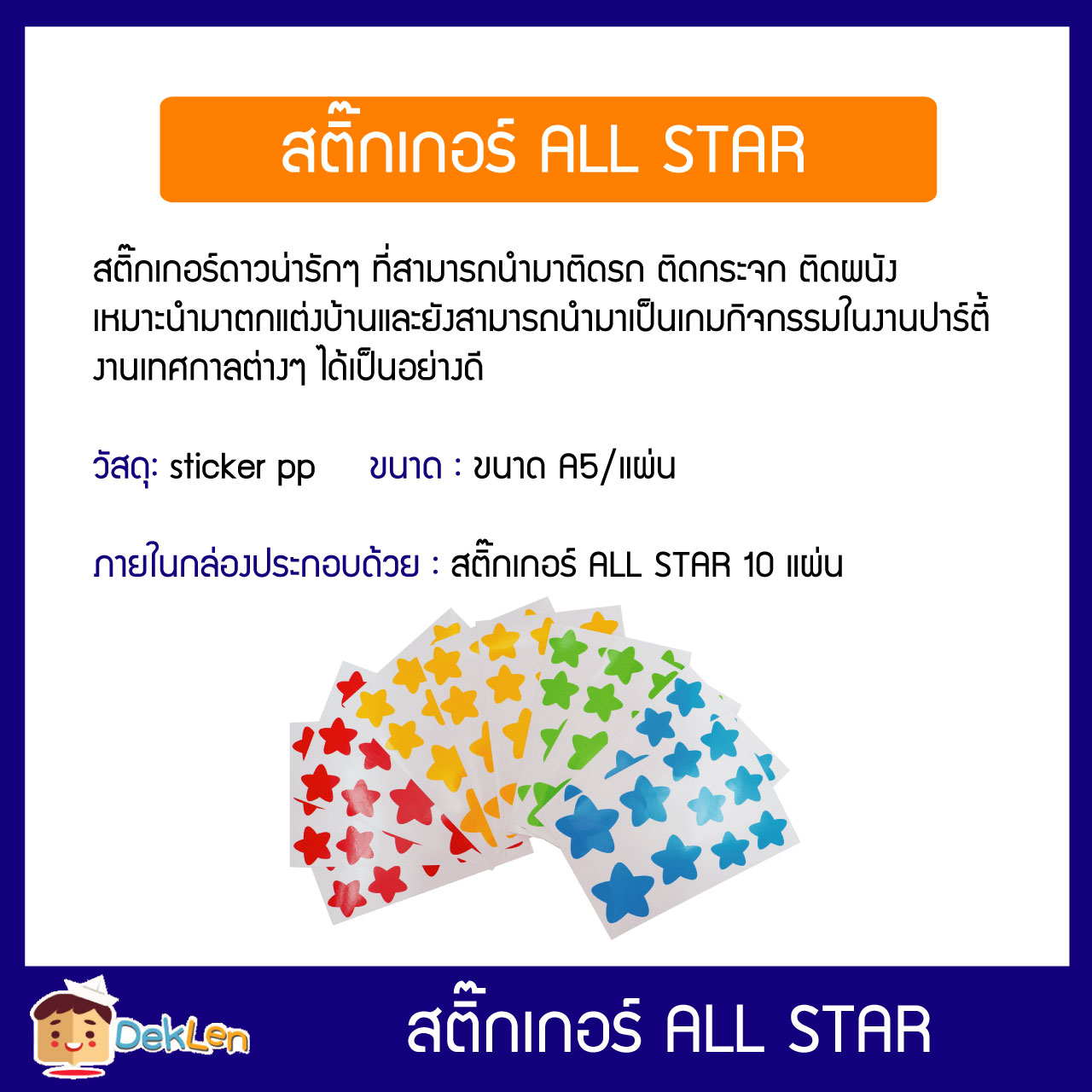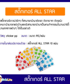 รายละเอียดสินค้า : สติ๊กเกอร์ ALL STAR (ALL STAR STICKER) เป็นสติ๊กเกอร์ดาวน่ารักๆ ที่สามารถนำมาติดรถ ติดกระจก ติดผนัง เหมาะนำมาตกแต่งบ้านและยังสามารถนำมาเป็นเกมกิจกรรมในงานปาร์ตี้ งานเทศกาลต่างๆ ได้เป็นอย่างดี