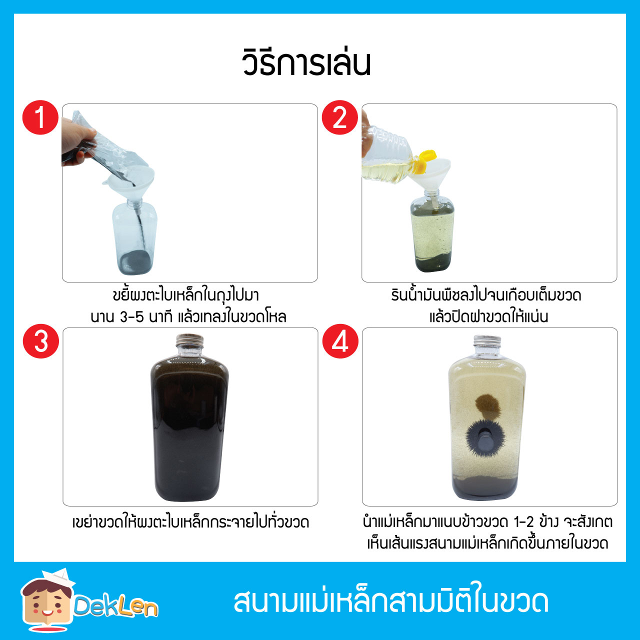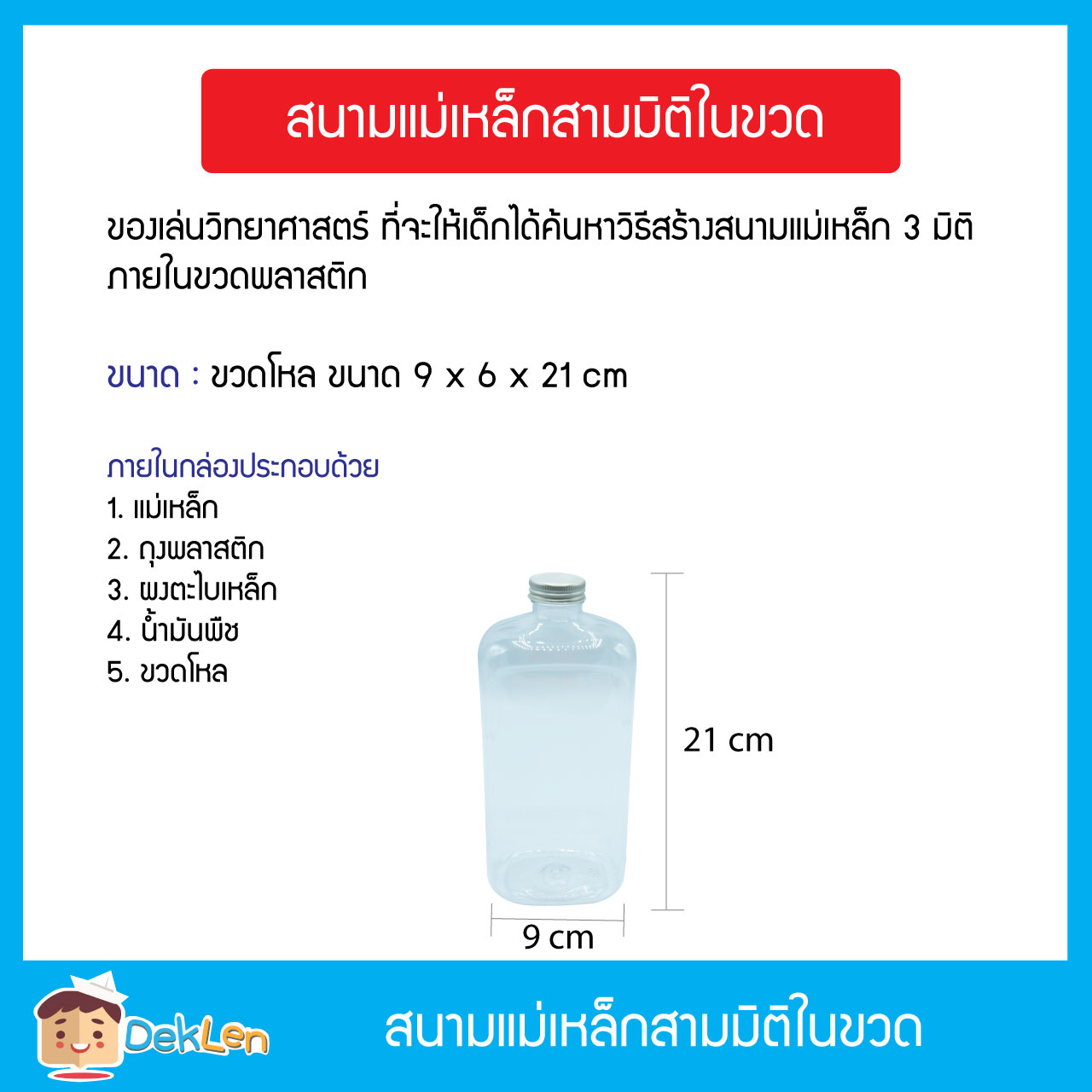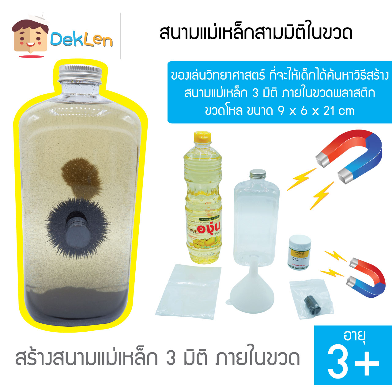 • สนามแม่เหล็กสามมิติในขวด เป็นของเล่นวิทยาศาสตร์ ที่จะให้เด็กได้ค้นหาวิธีสร้างสนามแม่เหล็ก 3 มิติ ภายในขวดพลาสติก
