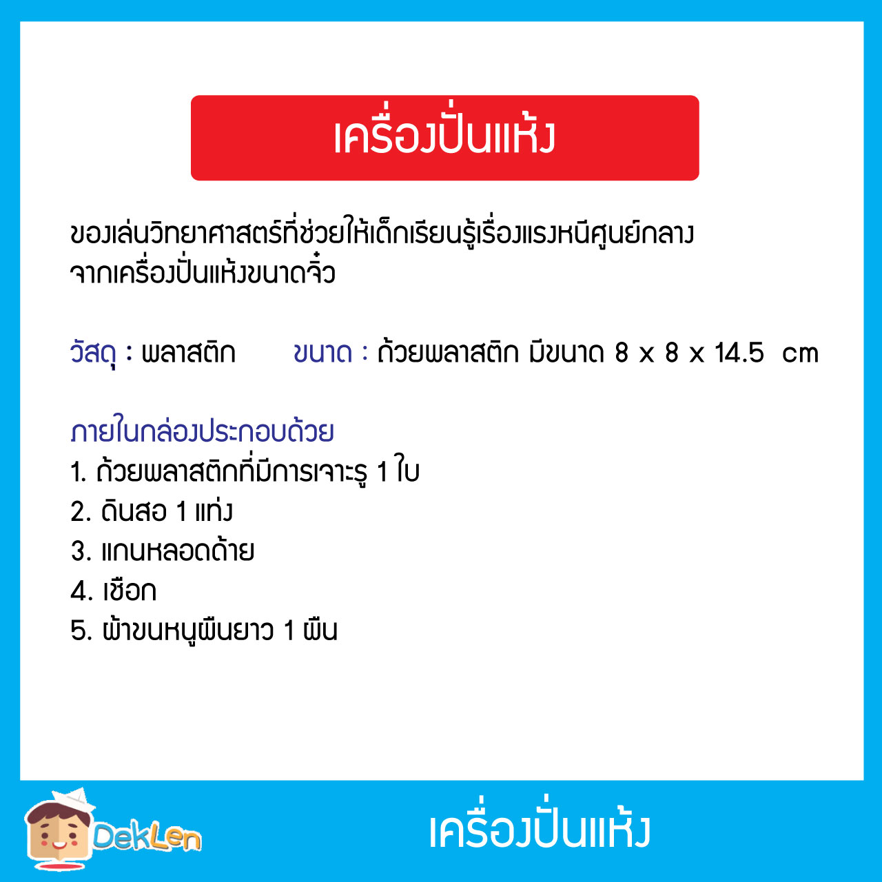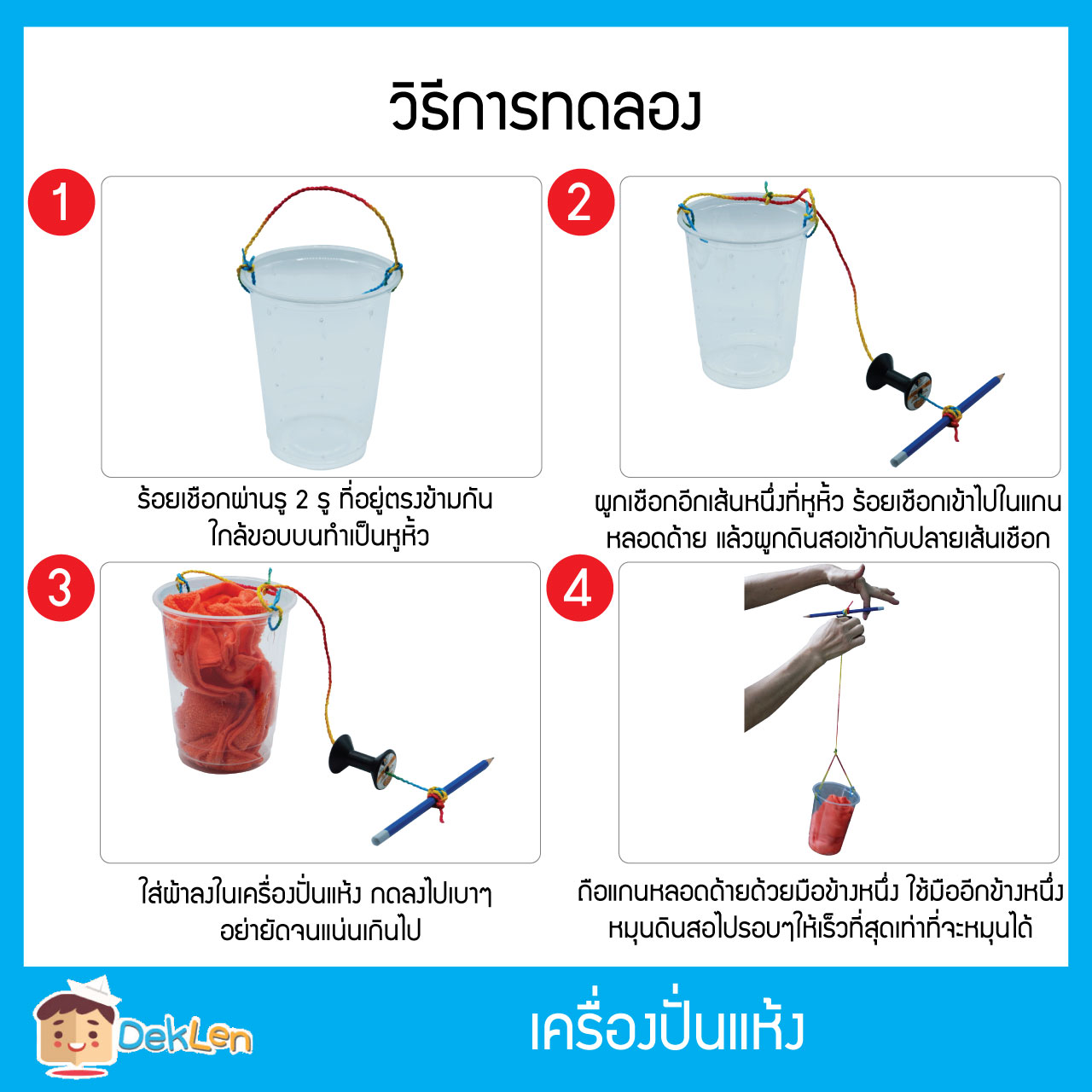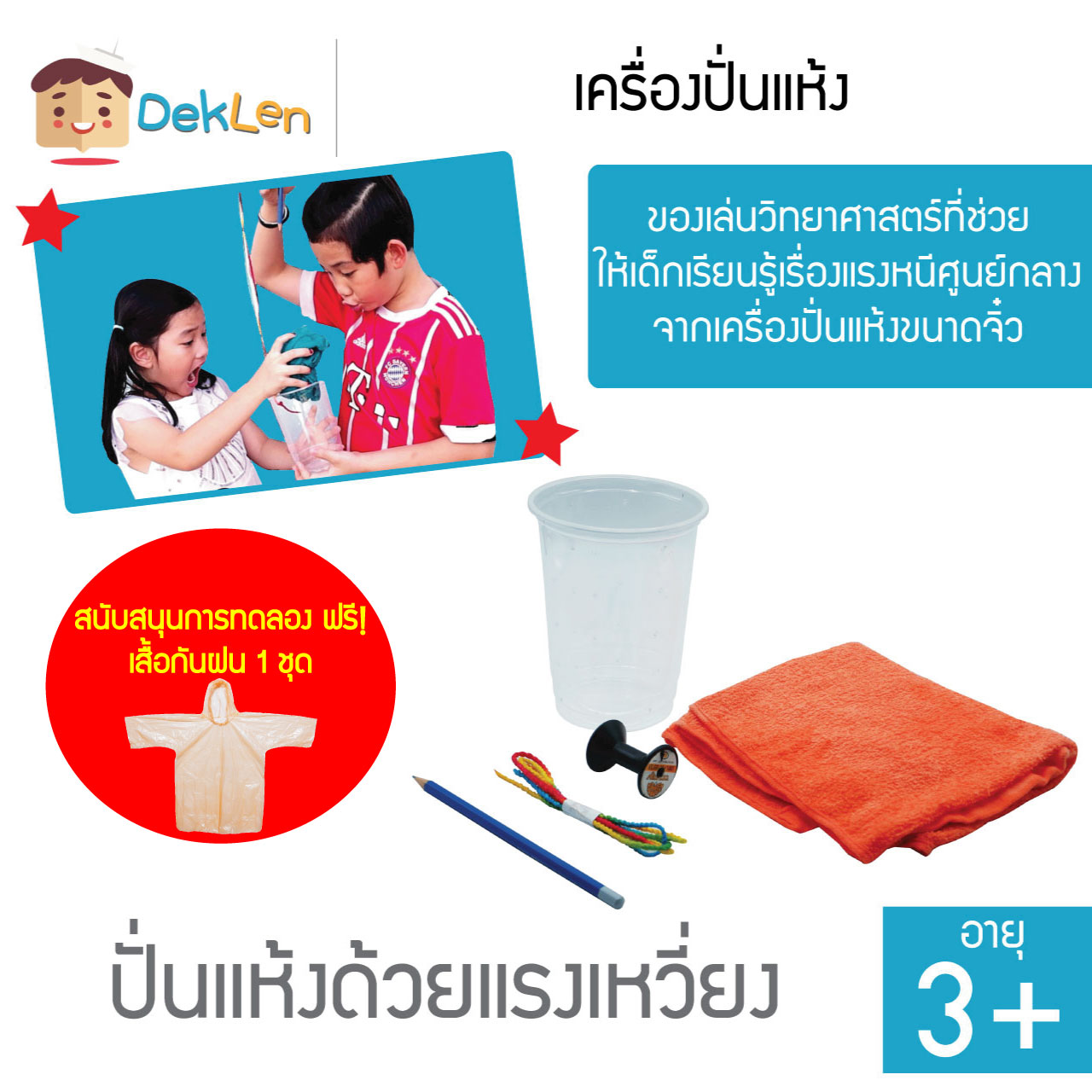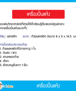 - ของเล่นชุดเครื่องปั่นแห้ง เป็นของเล่นวิทยาศาสตร์ที่ช่วยให้เด็กเรียนรู้เรื่องแรงหนีศูนย์กลางจากเครื่องปั่นแห้งขนาดจิ๋ว