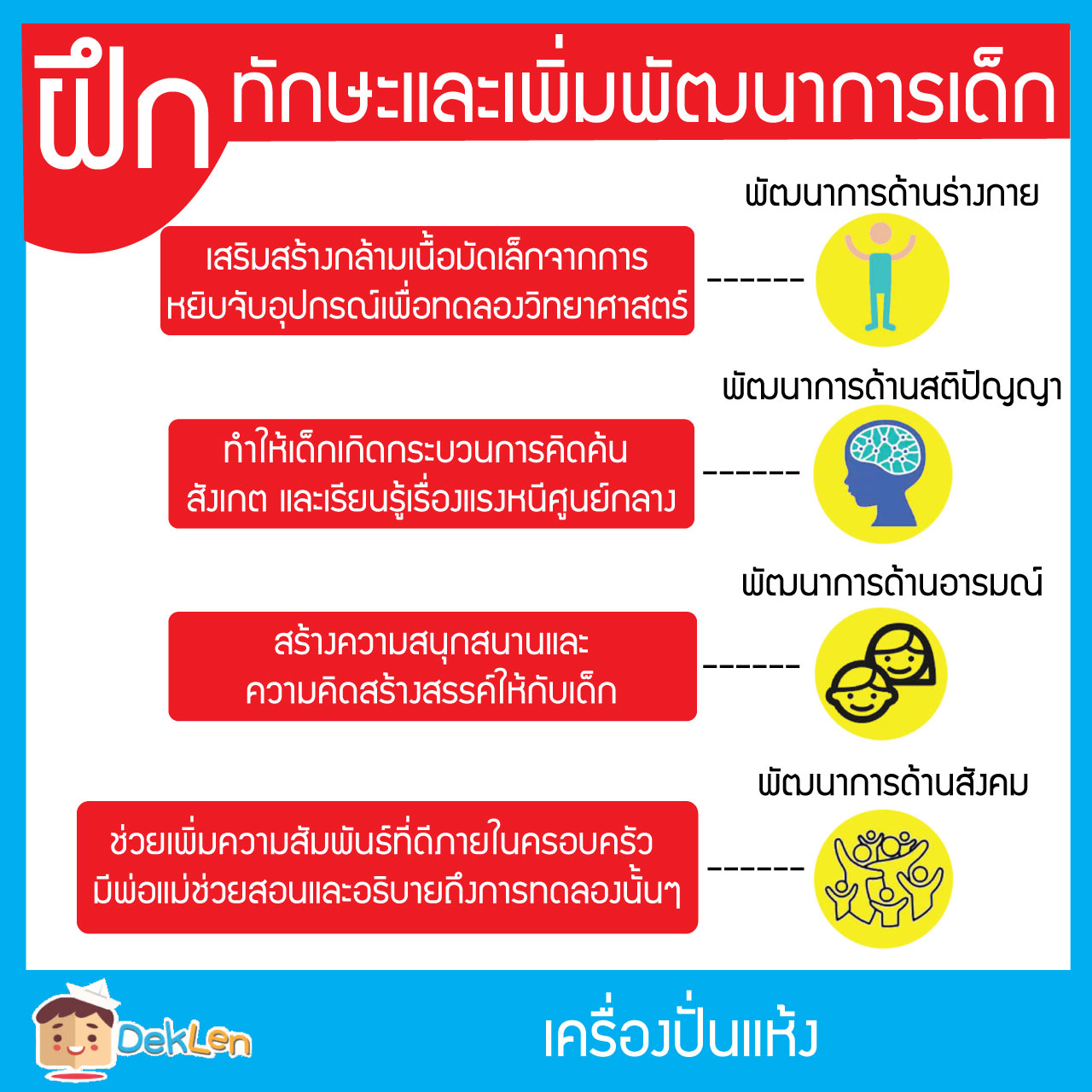 พัฒนาการด้านสังคม ช่วยเพิ่มความสัมพันธ์ที่ดีภายในครอบครัว มีพ่อแม่ ช่วยสอนและอธิบายถึงการทดลองนั้นๆ