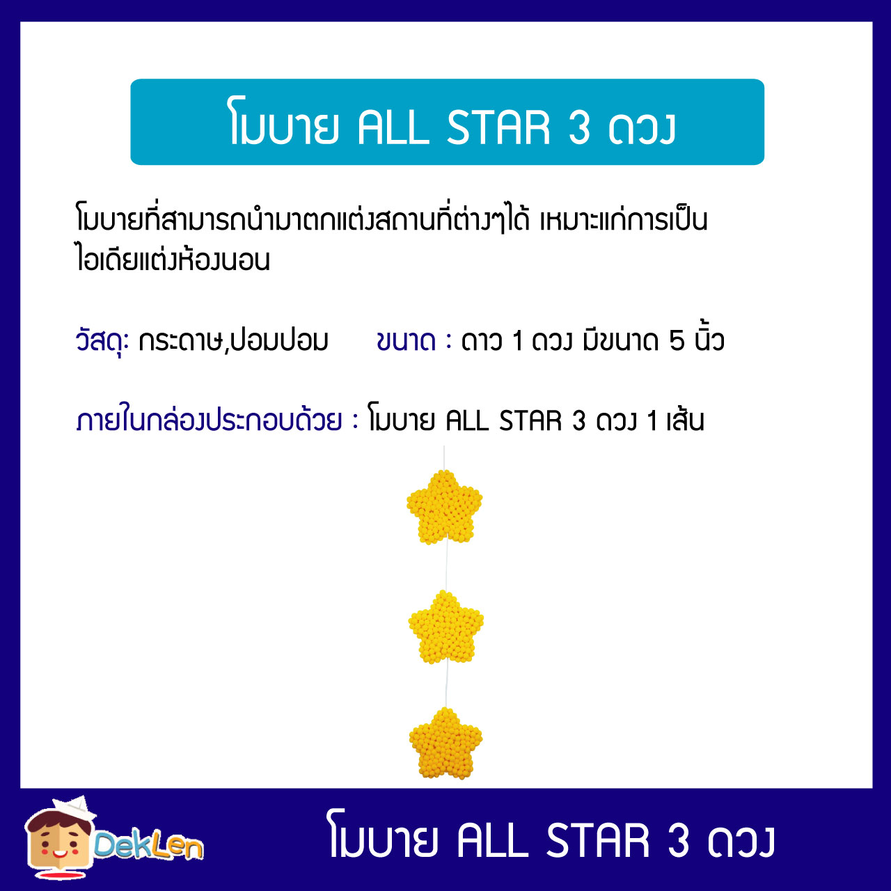 ขนาด : โมบาย ALL STAR 1 เส้น / ดาว 1 ดวง มีขนาด 5 นิ้ว