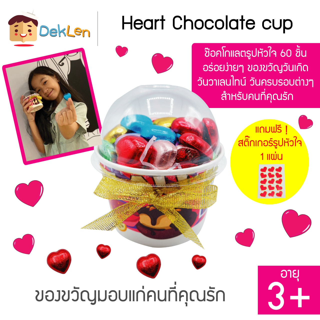 - ขนม Heart Chocolate cup คือ ถ้วยที่บรรจุขนมช๊อคโกแลตรูปหัวใจจำนวนมากมาย ประดับด้วยโบว์ที่มีสีสันสวยงาม เหมาะสำหรับเป็นของขวัญในโอกาสต่างๆ เช่น วันเกิด วันวาเลนไทน์ วันรับปริญญา งานปาร์ตี้ ฯลฯ