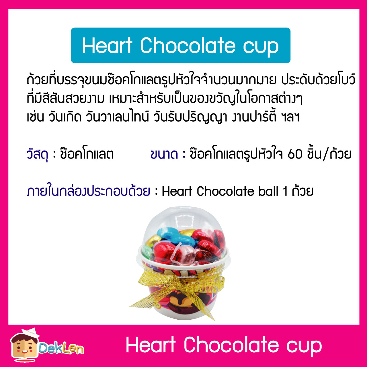 ขนาด : ช๊อคโกแลตรูปหัวใจ 60 ชิ้น/ถ้วย