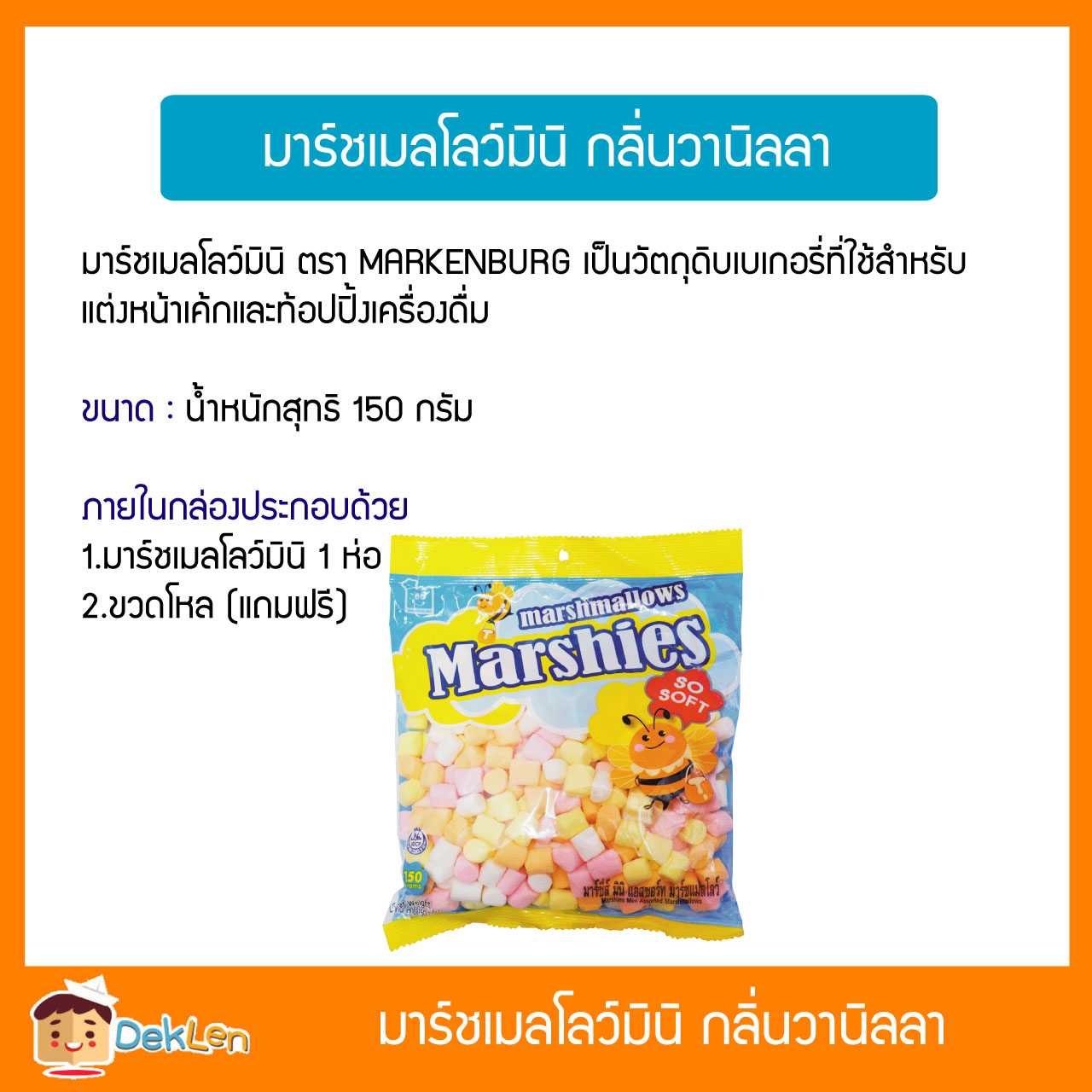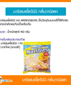 - มาร์ชเมลโลว์มินิ ตรา MARKENBURG เป็นวัตถุดิบเบเกอรี่ที่ใช้สำหรับแต่งหน้าเค้กและท้อปปิ้งเครื่องดื่ม