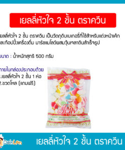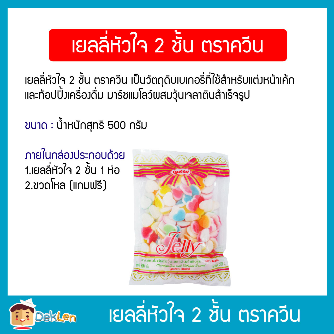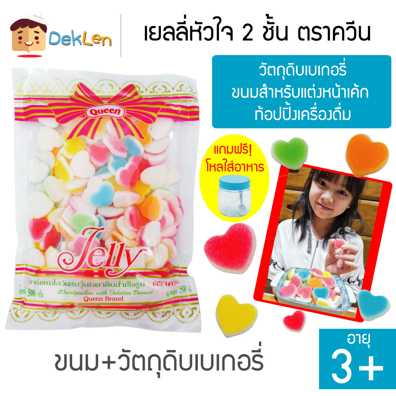 - เยลลี่หัวใจ 2 ชั้น ตราควีน เป็นวัตถุดิบเบเกอรี่ที่ใช้สำหรับแต่งหน้าเค้กและท้อปปิ้งเครื่องดื่ม มาร์ชแมโลว์ผสมวุ้นเจลาตินสำเร็จรูป
