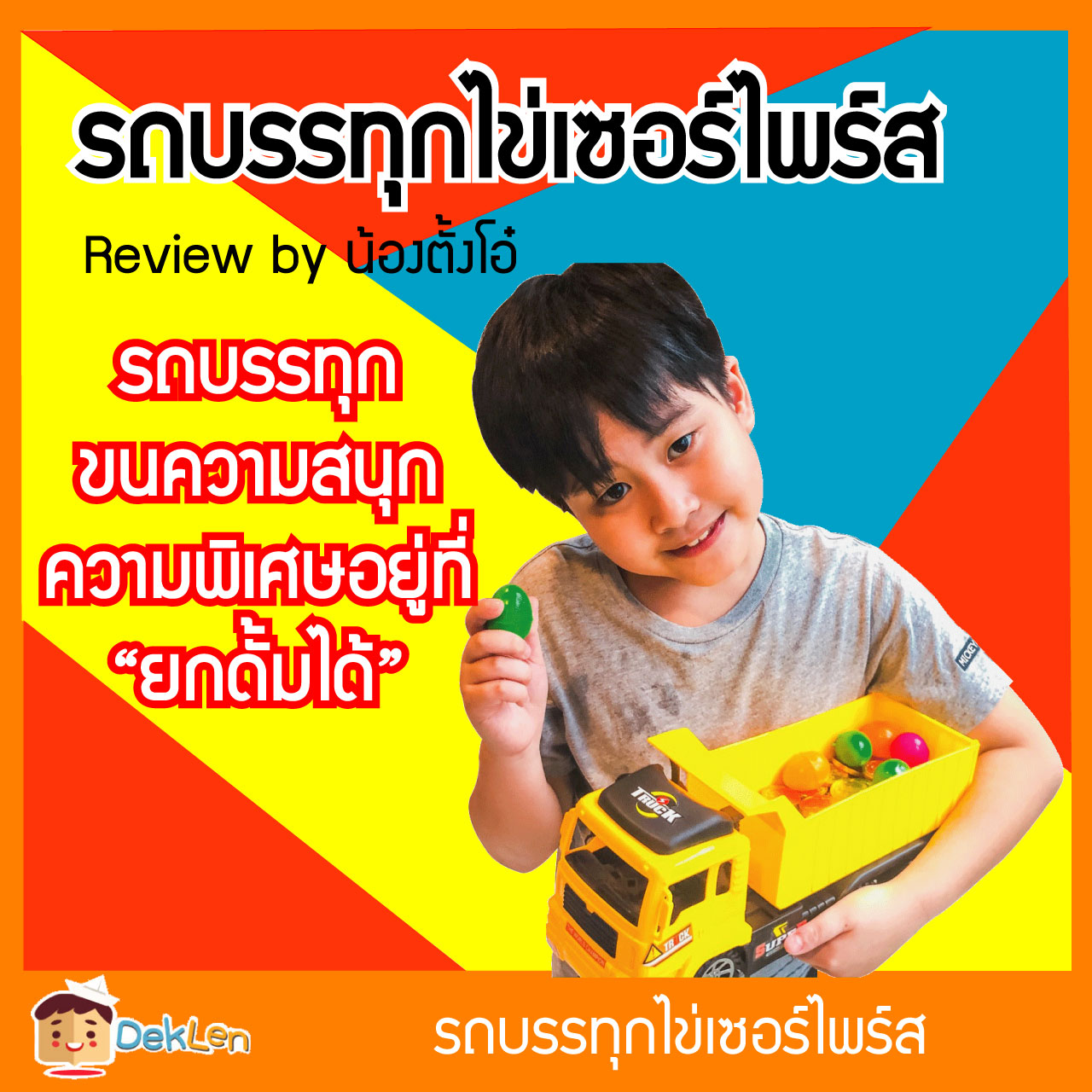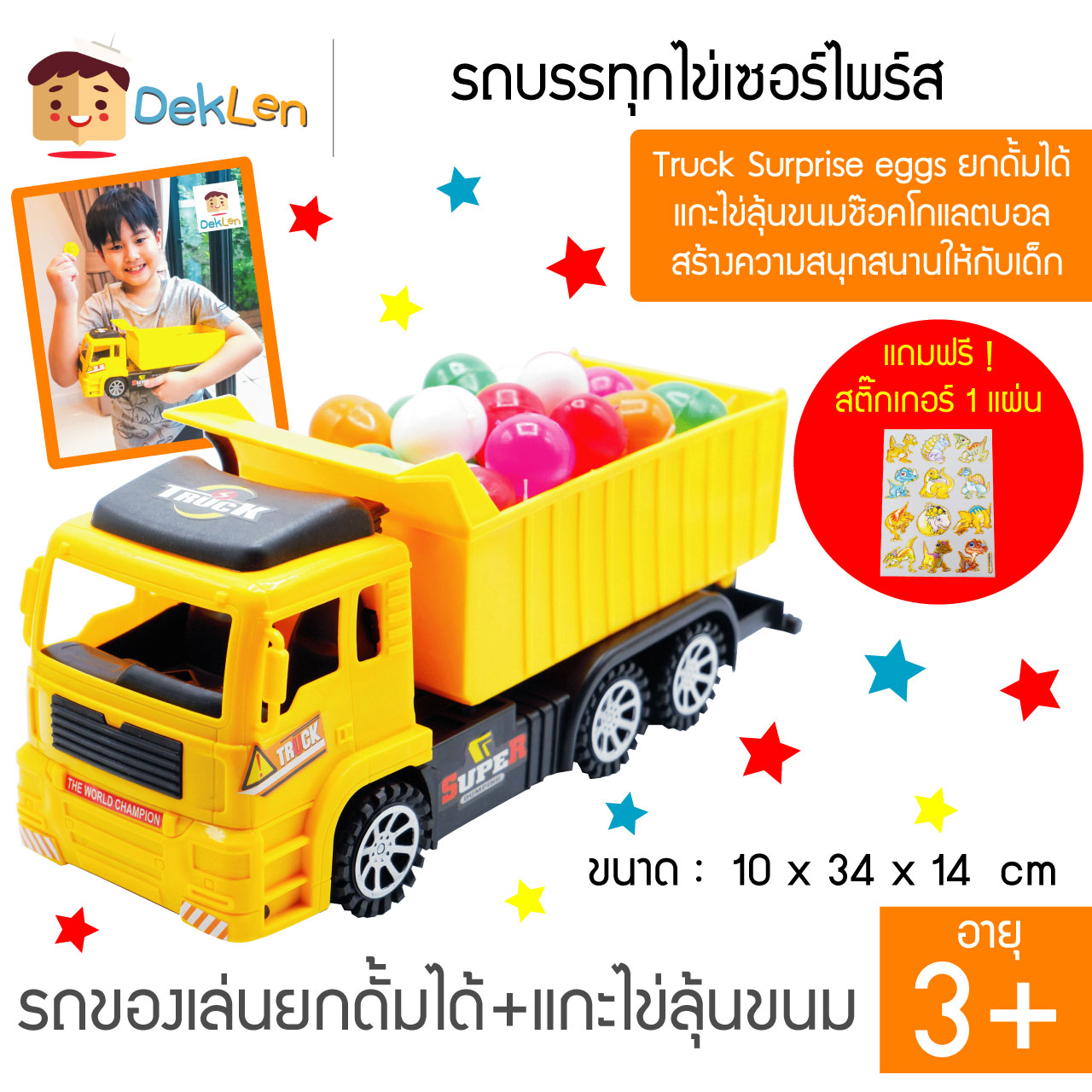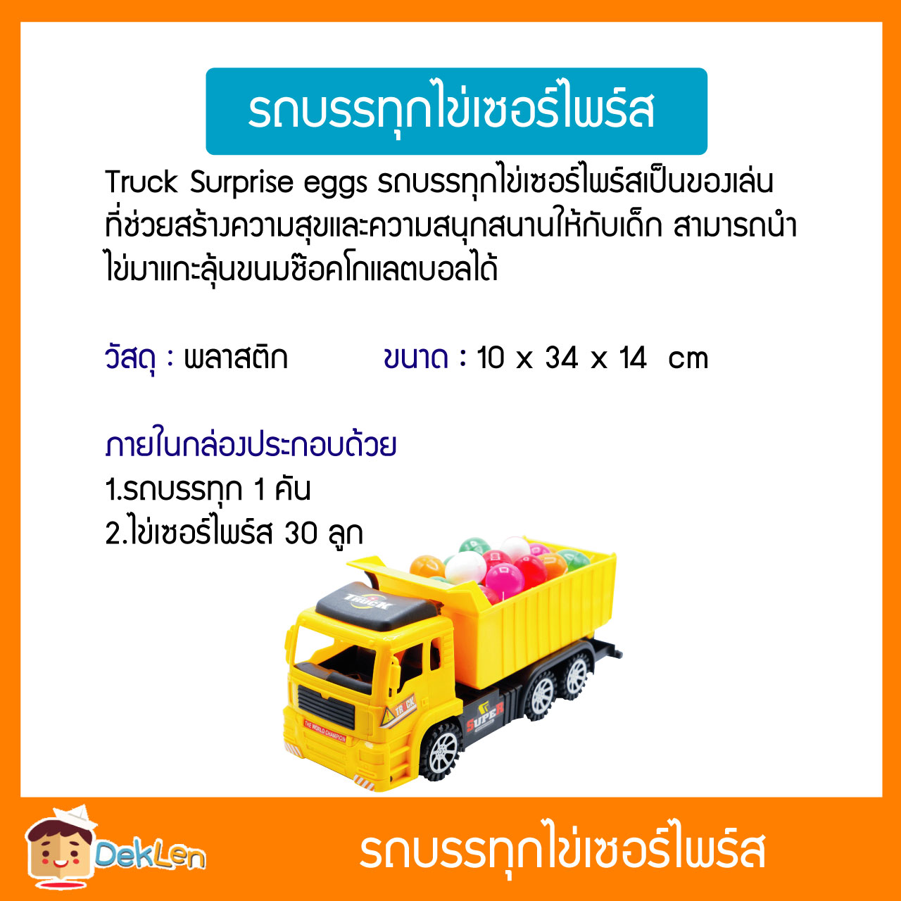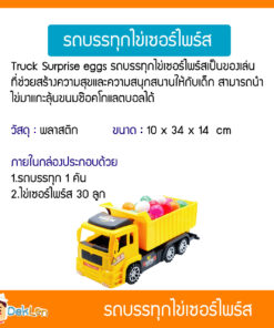 - Truck Surprise eggs รถบรรทุกไข่เซอร์ไพร์สเป็นของเล่นที่ช่วยสร้างความสุขและความสนุกสนานให้กับเด็ก สามารถนำไข่มาแกะลุ้นขนมช๊อคโกแลตบอลได้