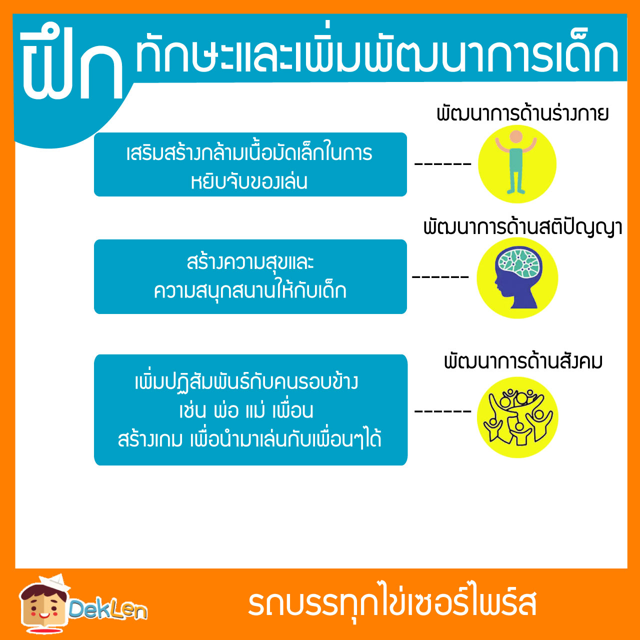 พัฒนาการด้านสังคม เพิ่มปฏิสัมพันธ์กับคนรอบข้าง เช่น พ่อ แม่ เพื่อน สร้าง เกม เพื่อนำมาเล่นกับเพื่อนๆได้
